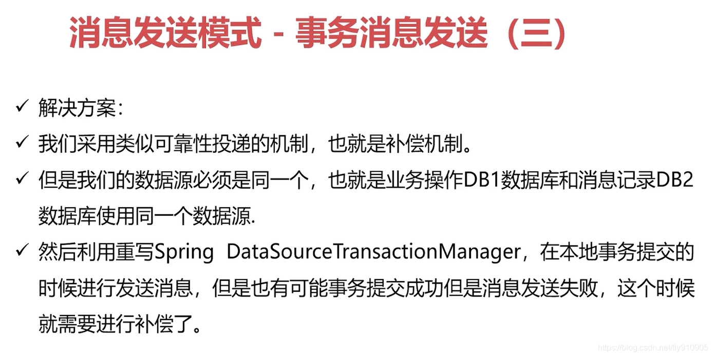 • 然后利用重写Spring DataSourceTransactionManager, 在本地事务提交的时候进行发送消息, 但是也有可能事务提交成功但是消息发送失败, 这个时候就需要进行补偿了。